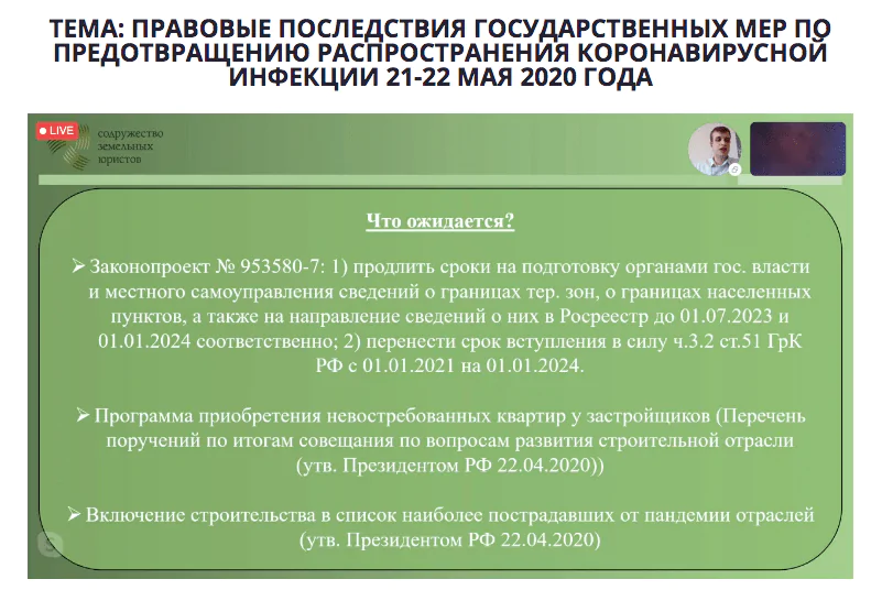 В рамках конференции Павел Лобачев, старший юрист Land Law Firm (ранее – Содружество Земельных Юристов) раскрыл сразу две особо обсуждаемые сейчас темы – арендные отношения и работа застройщиков в условиях пандемии. Павел поделился мнением о добросовестности в арендных отношениях тех или иных действий каждой из сторон, кроме того отметив последние изменения в отношении отсрочки и уменьшения платежей и права в одностороннем порядке отказаться от договора аренды. В части изменений в законодательстве в сфере строительства и ДДУ, Павел обозначил и прокомментировал меры поддержки строительной отрасли, реализацию строительных проектов в период пандемии и после ее окончания, а также меры ответственности застройщиков и дольщиков в текущих реалиях.