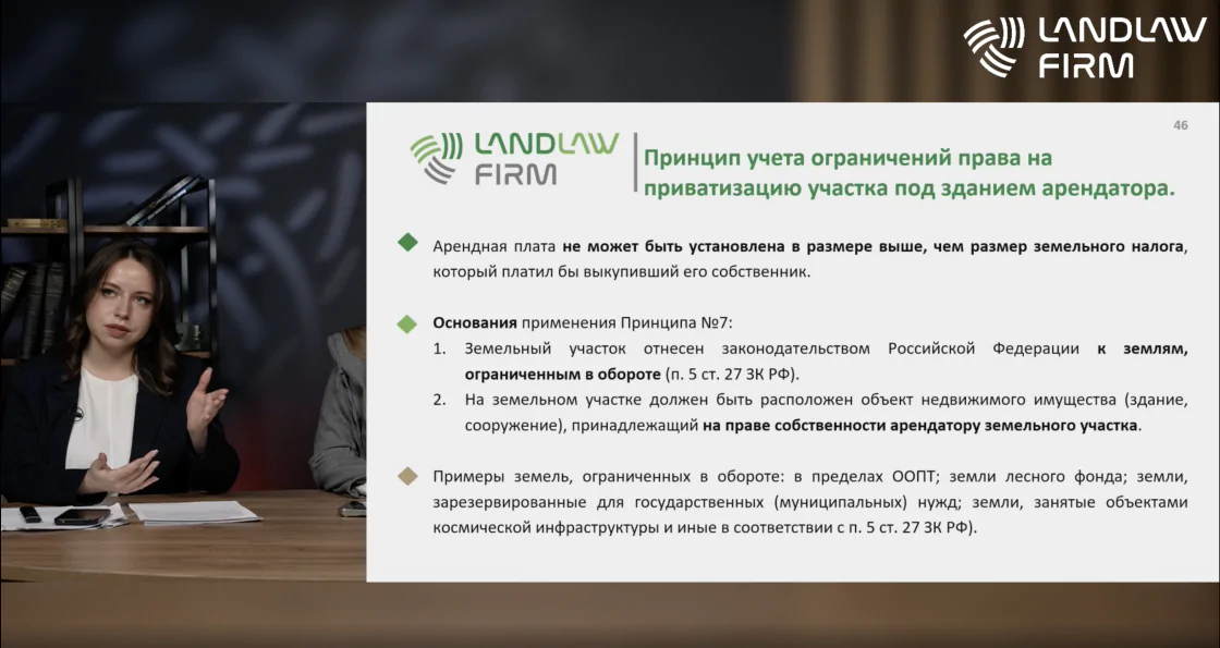 Кристина Мершон сосредоточилась на принципах определения арендной платы за земельные участки, находящиеся в государственной или муниципальной собственности. С 1 января 2026 года вступает в силу Федеральный закон № 321-ФЗ, который закрепляет: размер арендной платы определяется на основании кадастровой стоимости участка, за исключением случаев, прямо указанных в законе.