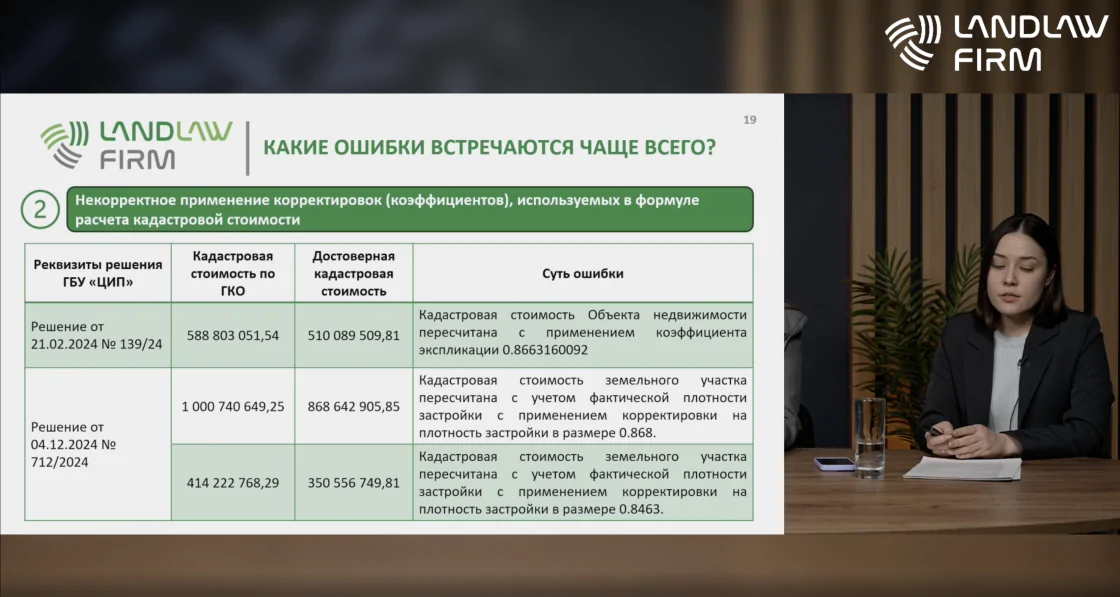 Мария Денисова подробно разобрала механизм снижения имущественных платежей через исправление ошибок, допущенных при государственной кадастровой оценке. Она напомнила: кадастровая стоимость определяется методом массовой оценки, что неизбежно ведет к неточностям. Закон о кадастровой оценке выделяет три типа ошибок — методологические (некорректная расчетная модель), технические (описки, арифметические ошибки) и искажение данных об объекте (использование недостоверных характеристик).